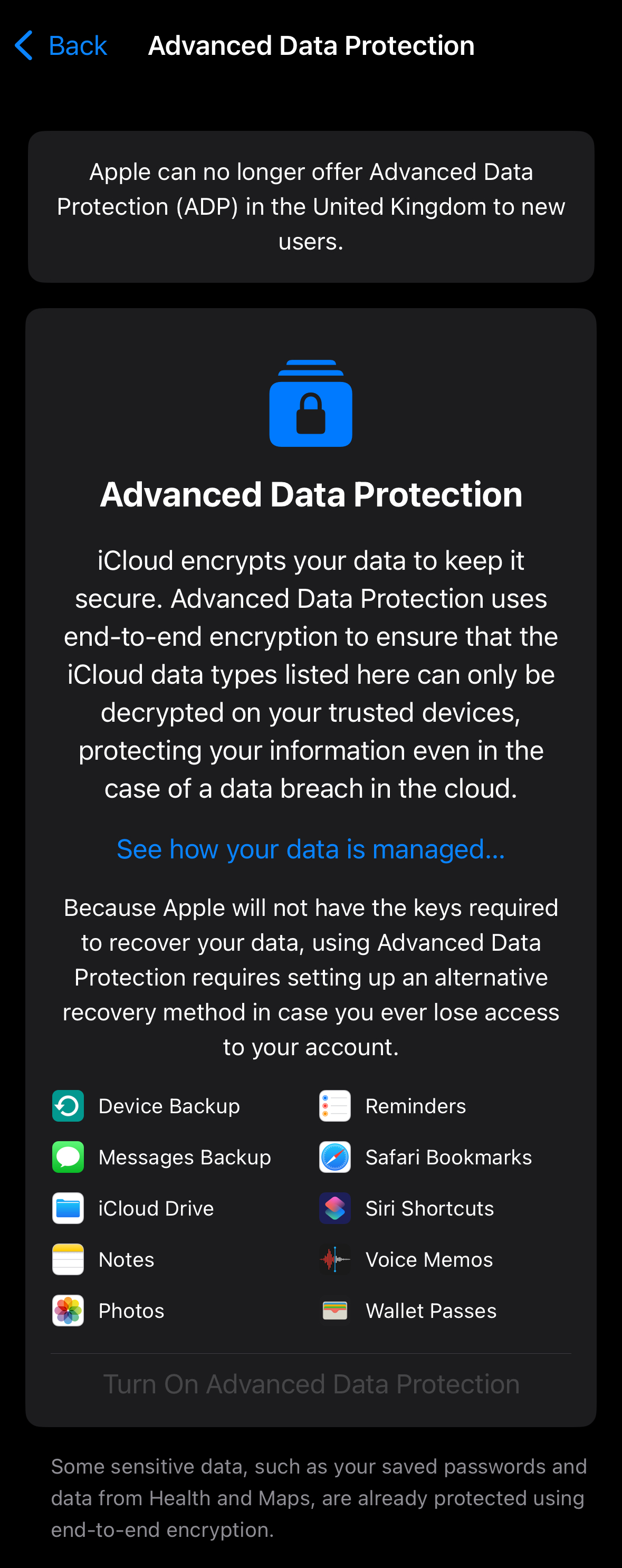 Knowing that such a change would impact users worldwide, Apple instead disabled Advanced Data Protection for UK users in February 2025.1 By doing so, they complied with the request without compromising encryption for everyone else.